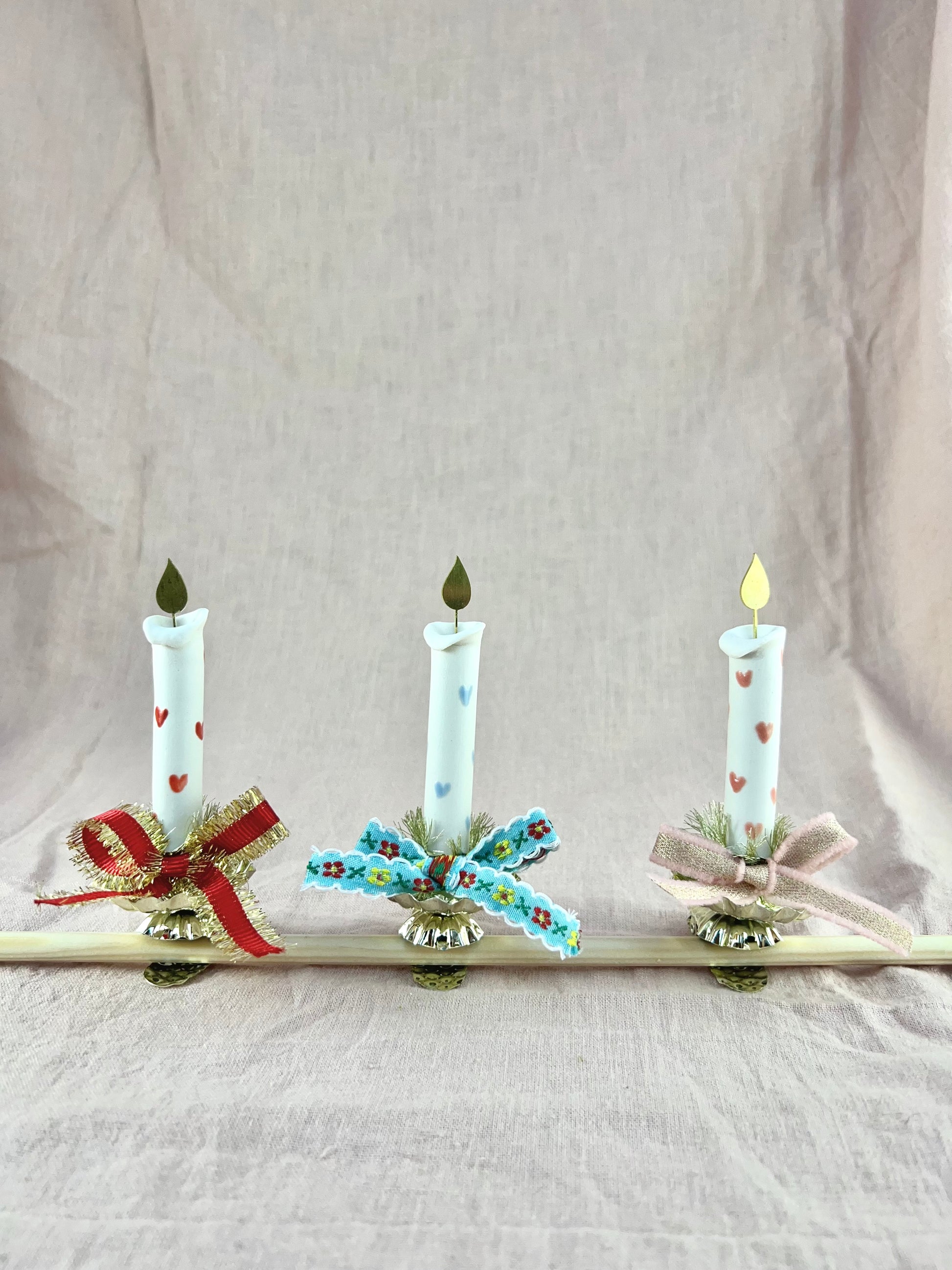 Tre skønne Evighedslys i porcelæn, med en messingflamme på toppen og en klips i bunden. Hvert lys er håndlavet og håndmalet med forskellige illustrationer. Lysene kan klipses på juletræet, hvor messingflammen på smukkeste vis reflekterer lyset fra juletræets lyskæde. Lysene kan også klipses på bøger der ligger ned, en lille hylde, en krans eller hvad end man kan finde på.