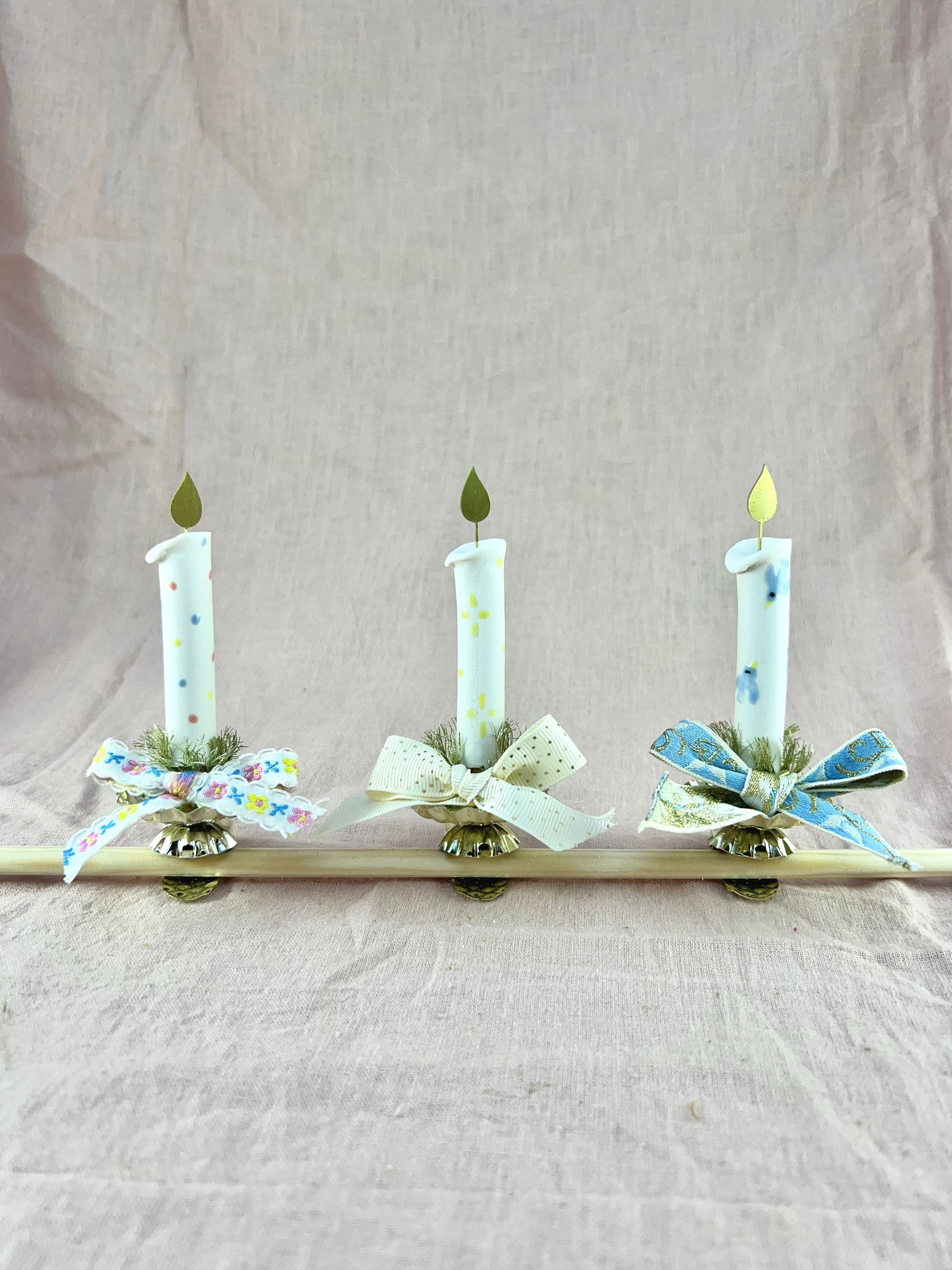 Tre skønne Evighedslys i porcelæn, med en messingflamme på toppen og en klips i bunden. Hvert lys er håndlavet og håndmalet med forskellige illustrationer. Lysene kan klipses på juletræet, hvor messingflammen på smukkeste vis reflekterer lyset fra juletræets lyskæde. Lysene kan også klipses på bøger der ligger ned, en lille hylde, en krans eller hvad end man kan finde på.