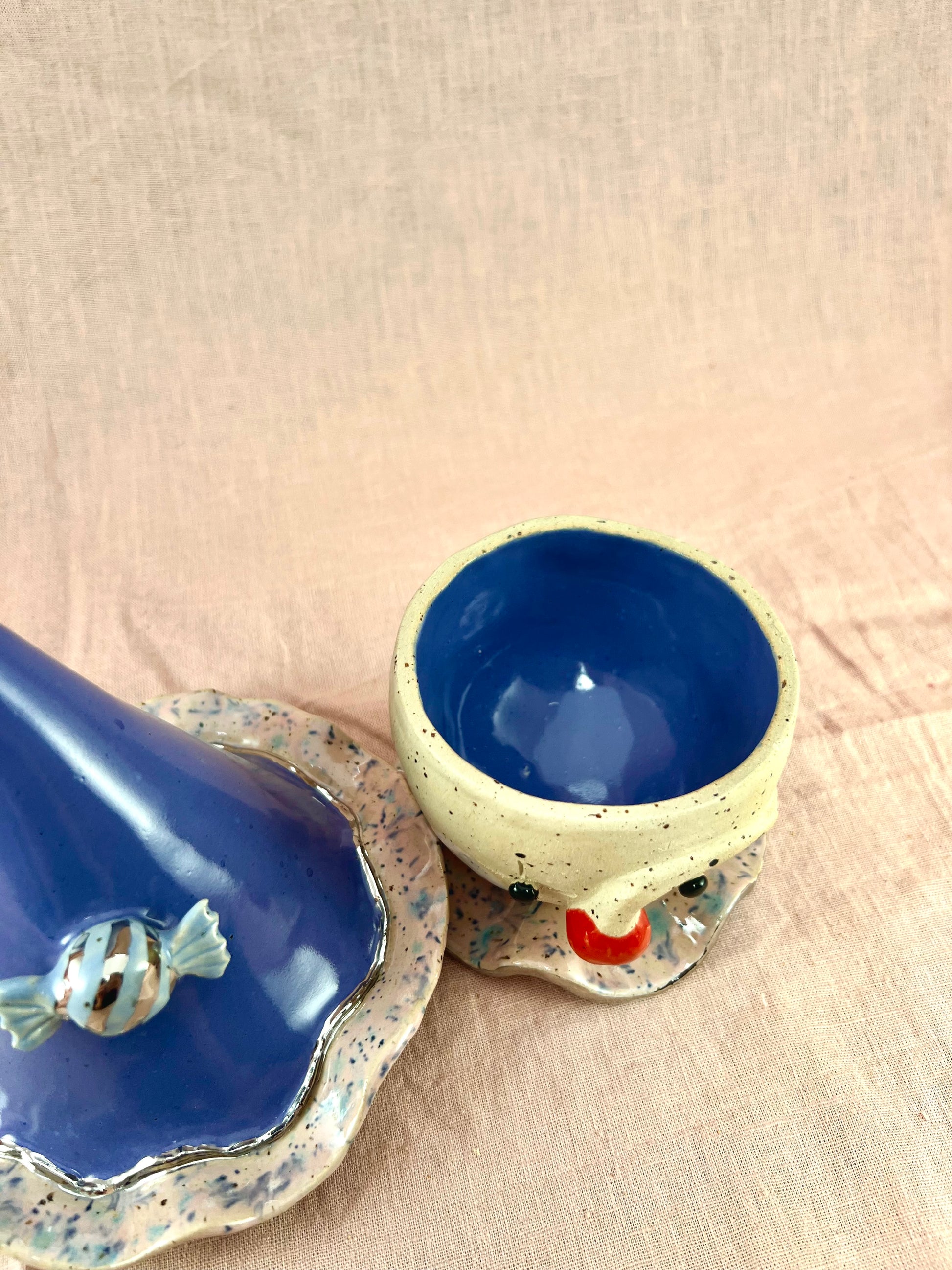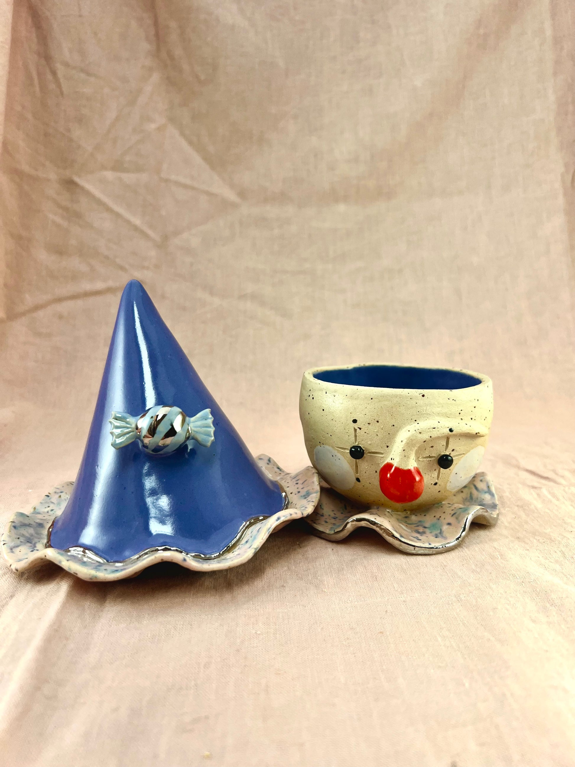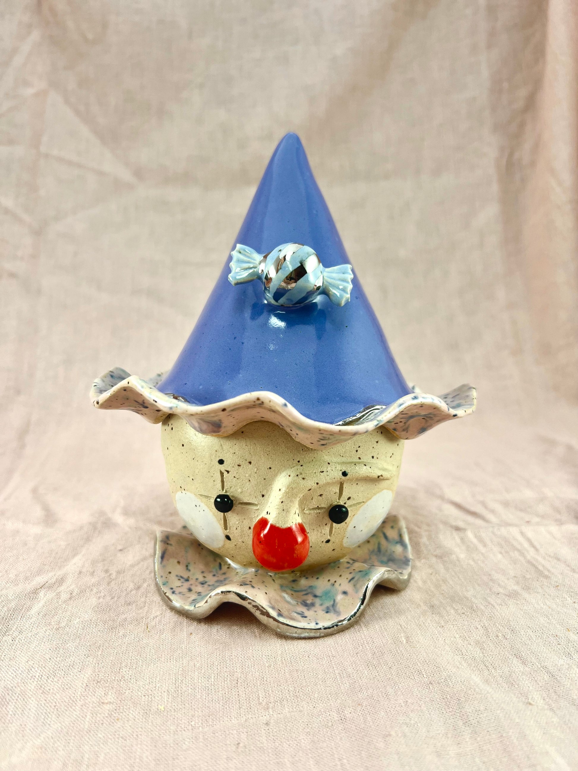 Julens lågkrukke, med plads til slik, nødder, pebernødder eller andre julegodter inde under klovnens fine hat ✨