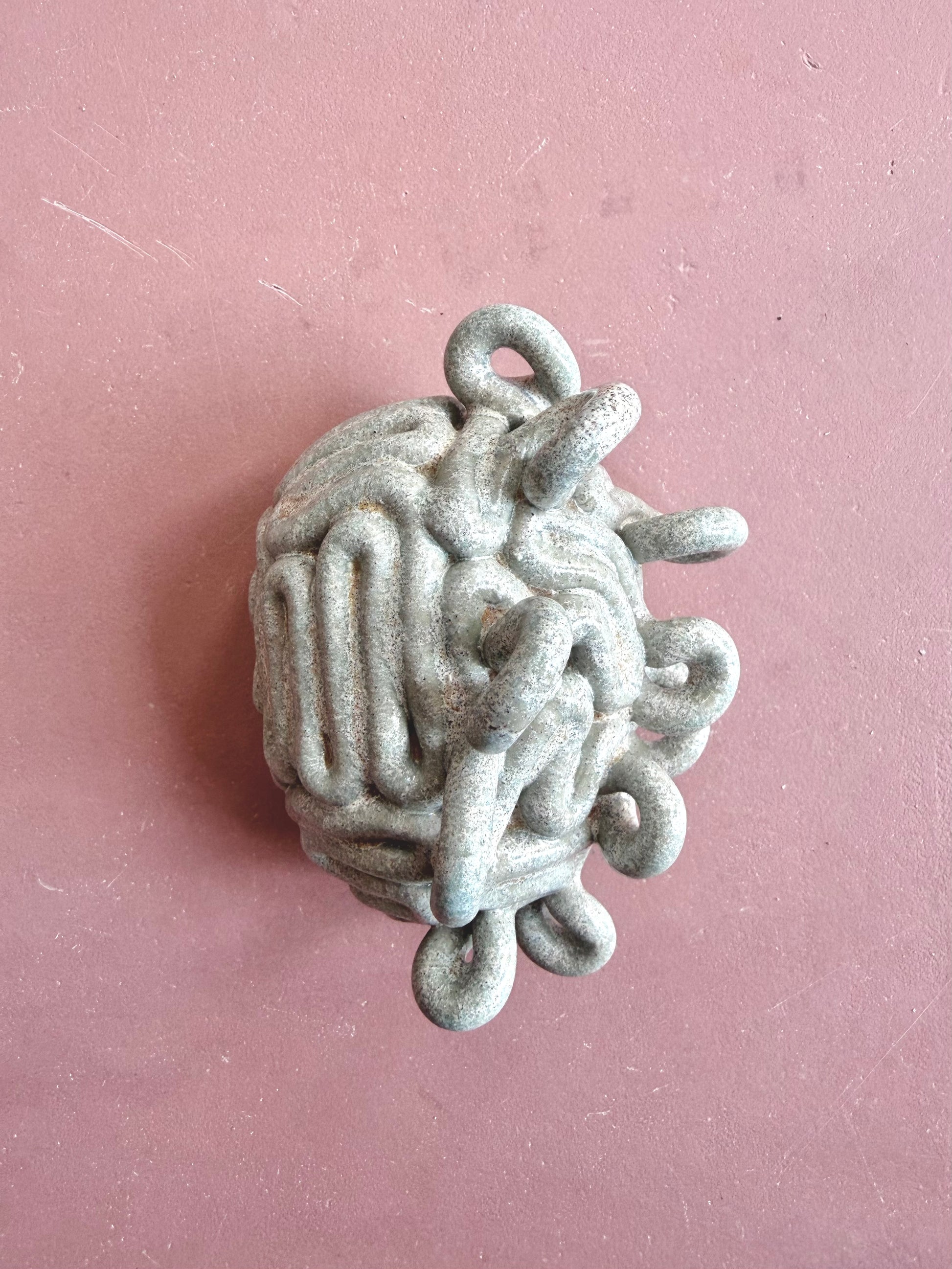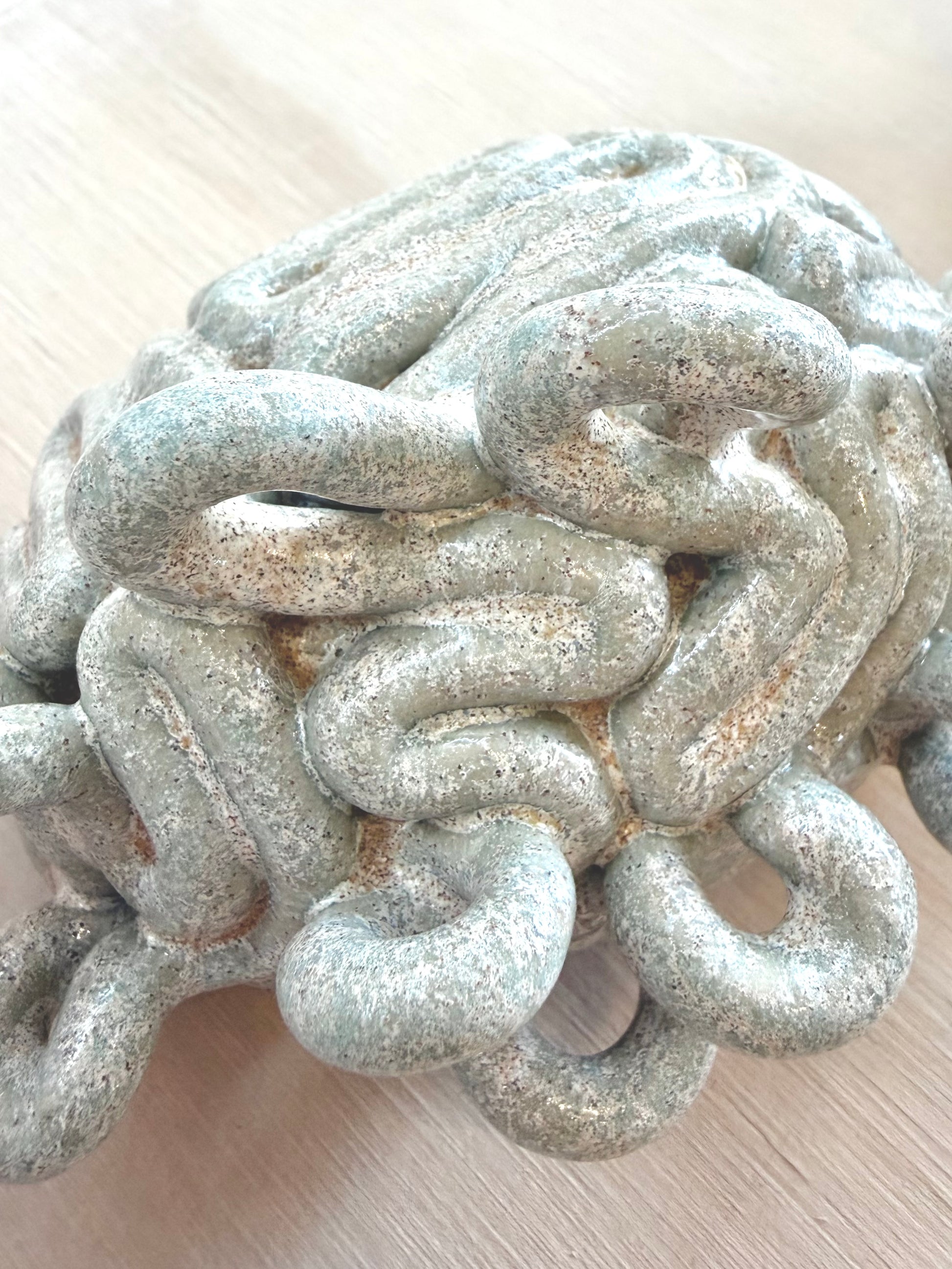 Lille krøllet hjerne med en smuk isblå glasur, med lyst beige og terracottarødt spil