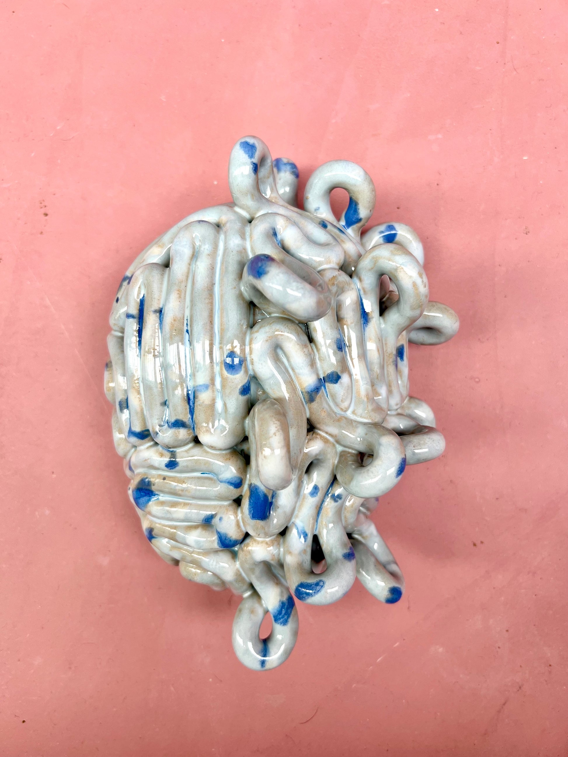 Krøllet hjerne i en isblå glasur, med strejf af hvid og mørkeblå.