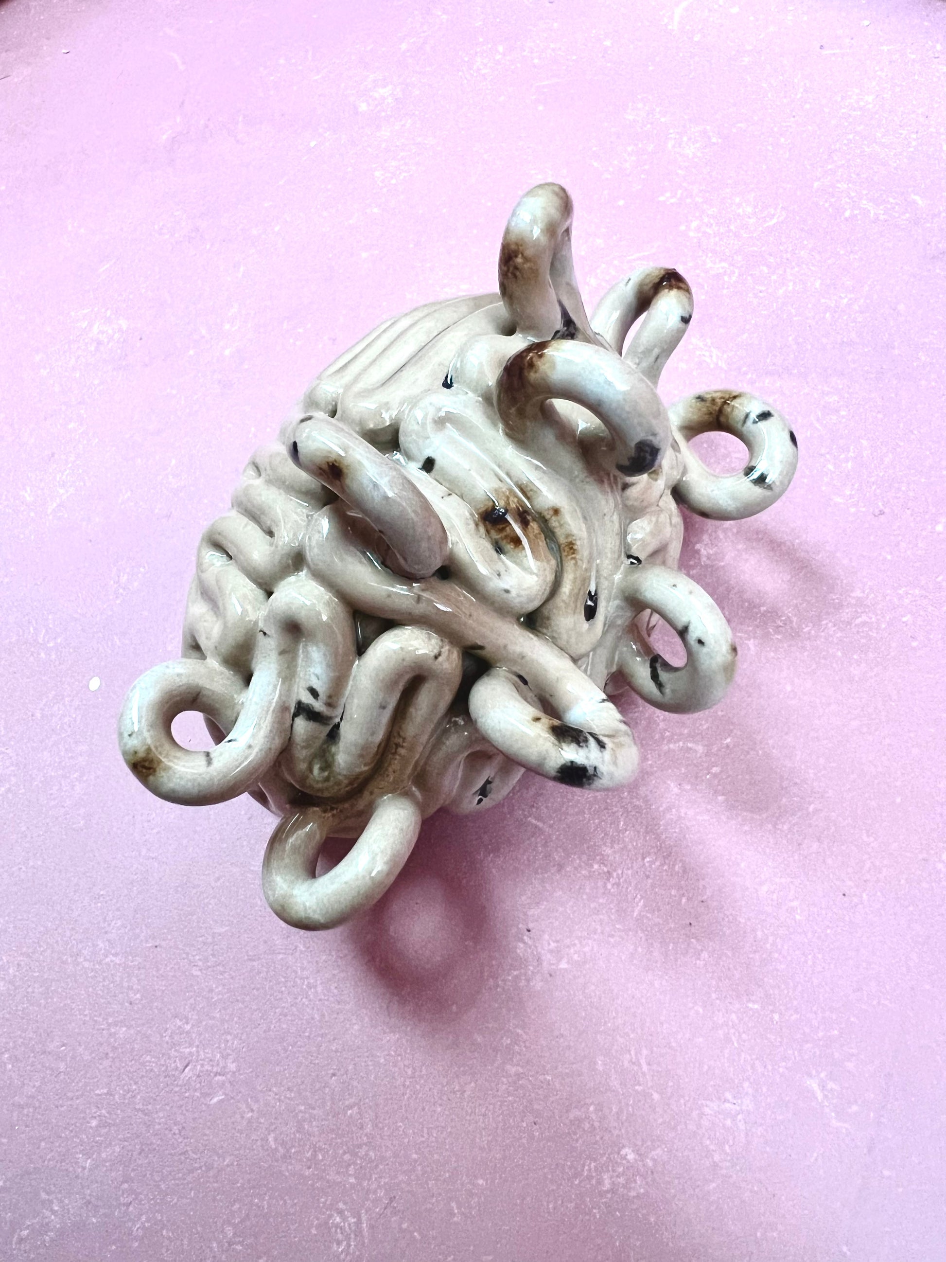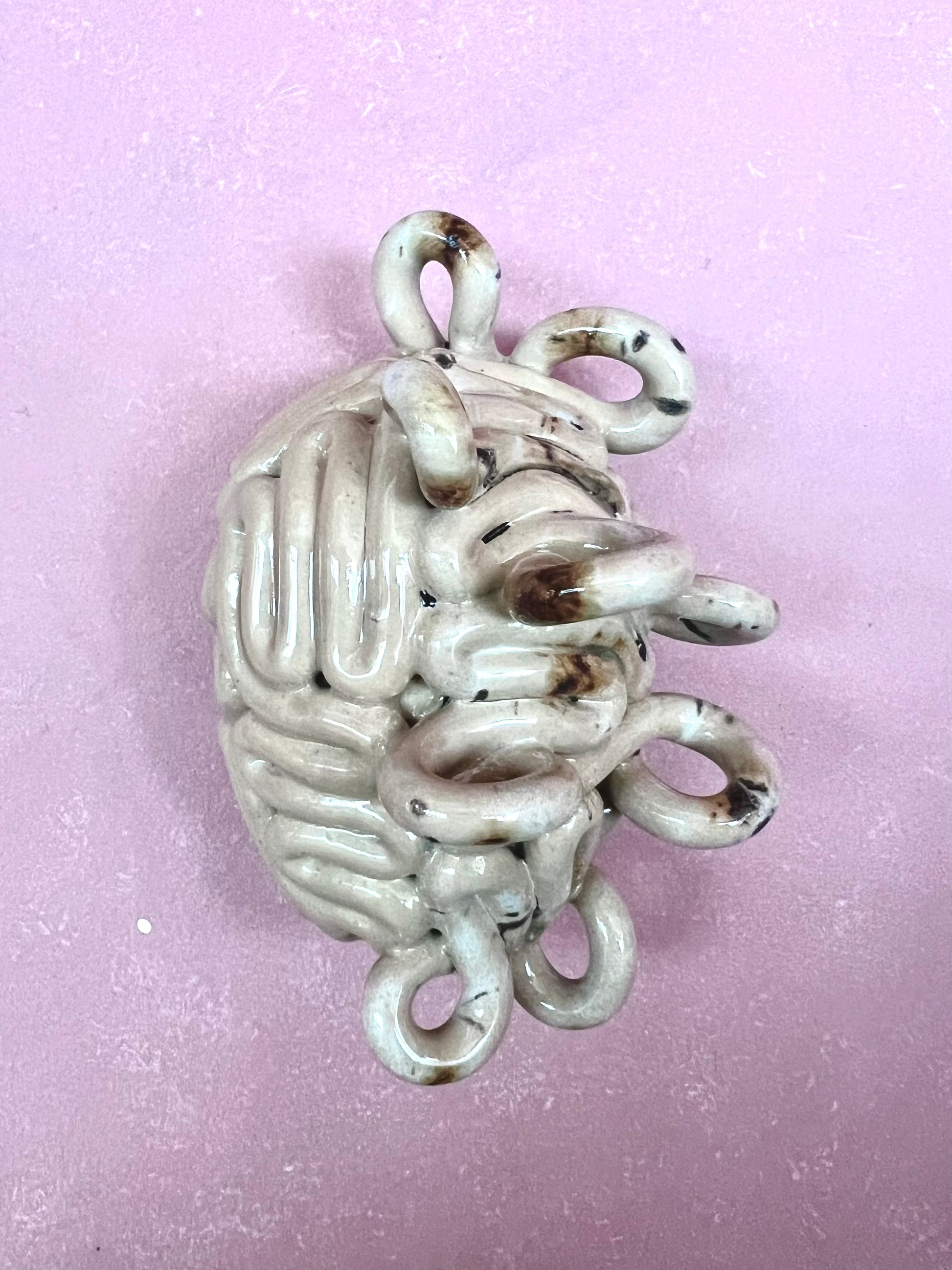 Lille krøllet hjerne med en beige glasur på den ene halvdel og et beige latté mix på den krøllede halvdel