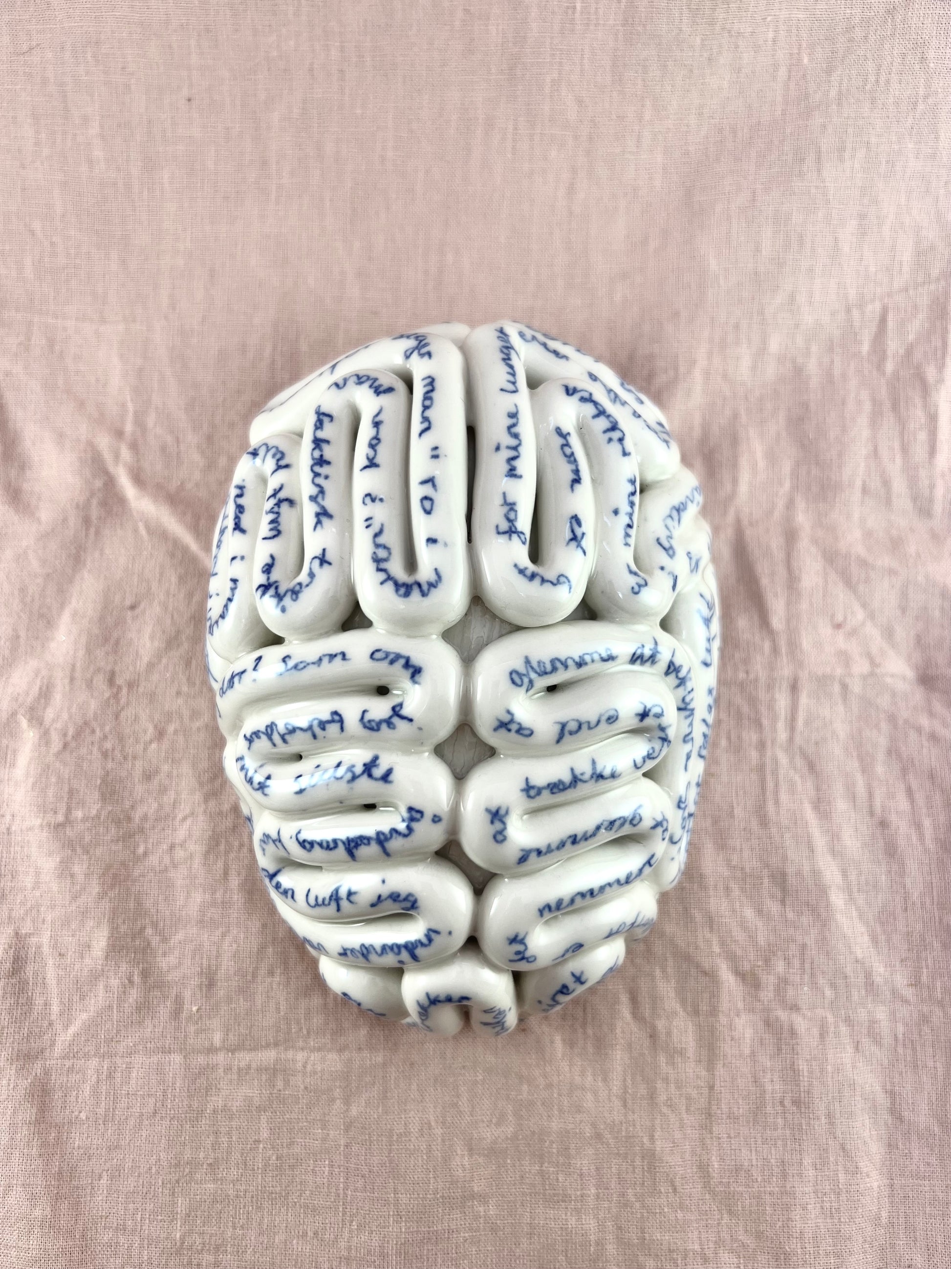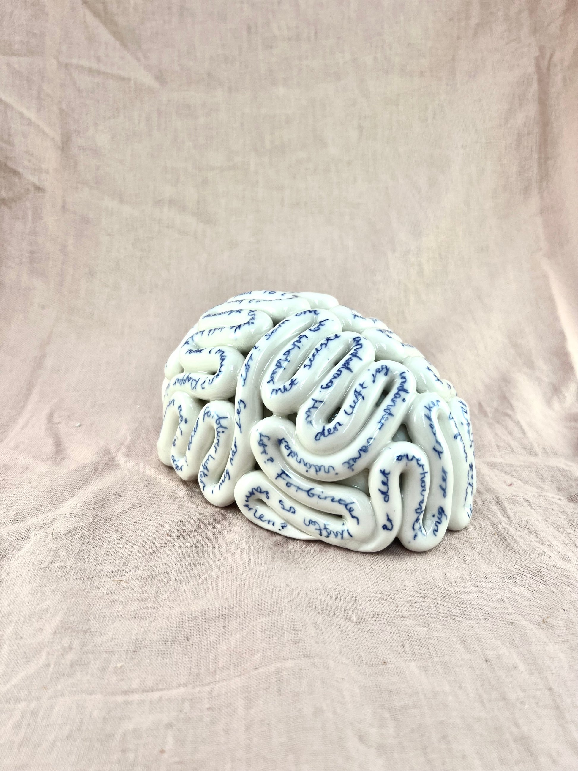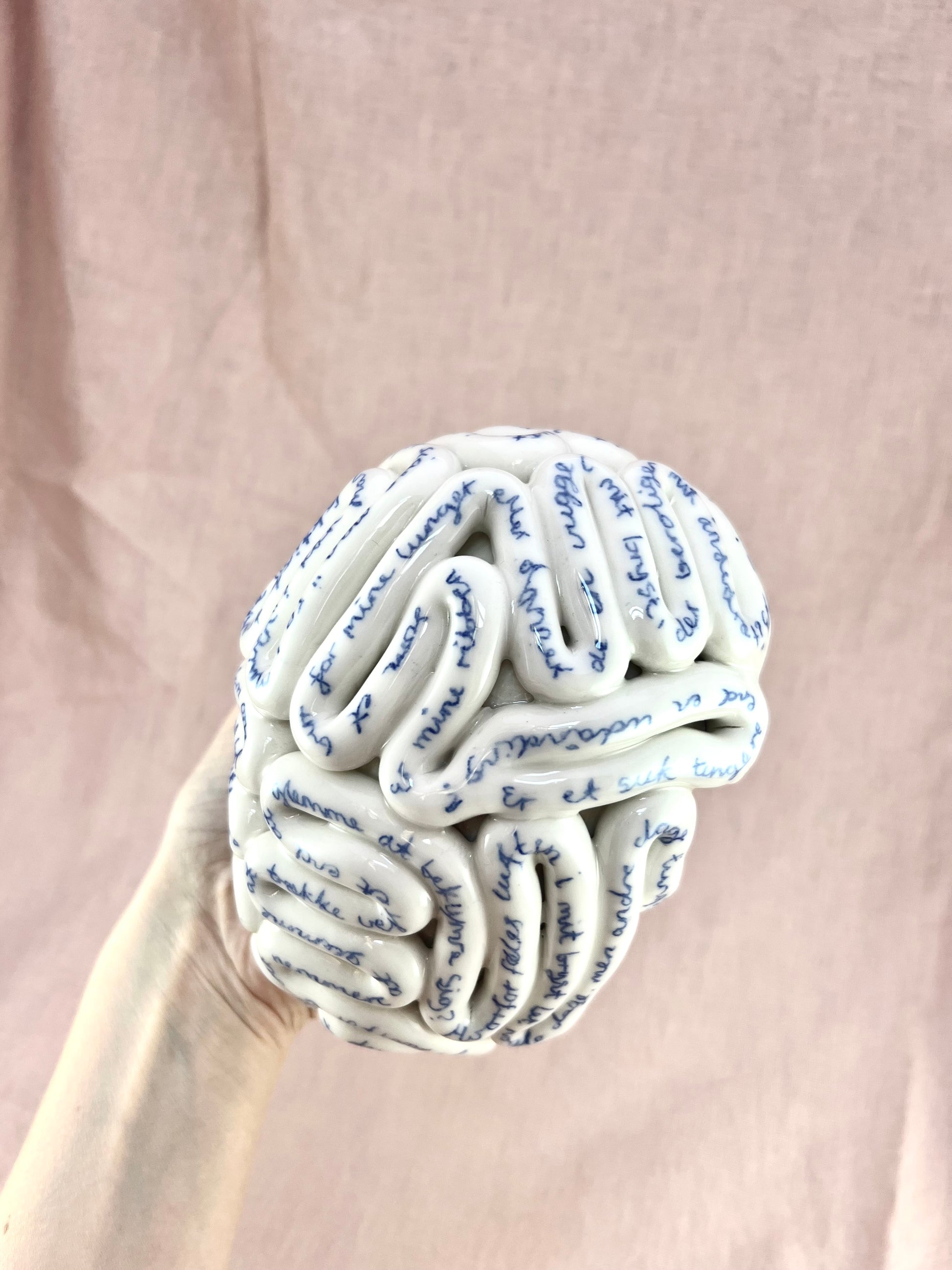 Tankemylderhjerne i porcelæn, med skrevet tankemylder i blå skrift. Hver Tankemylderhjerne er helt unik med sin egen unikke håndskrevede tekst.